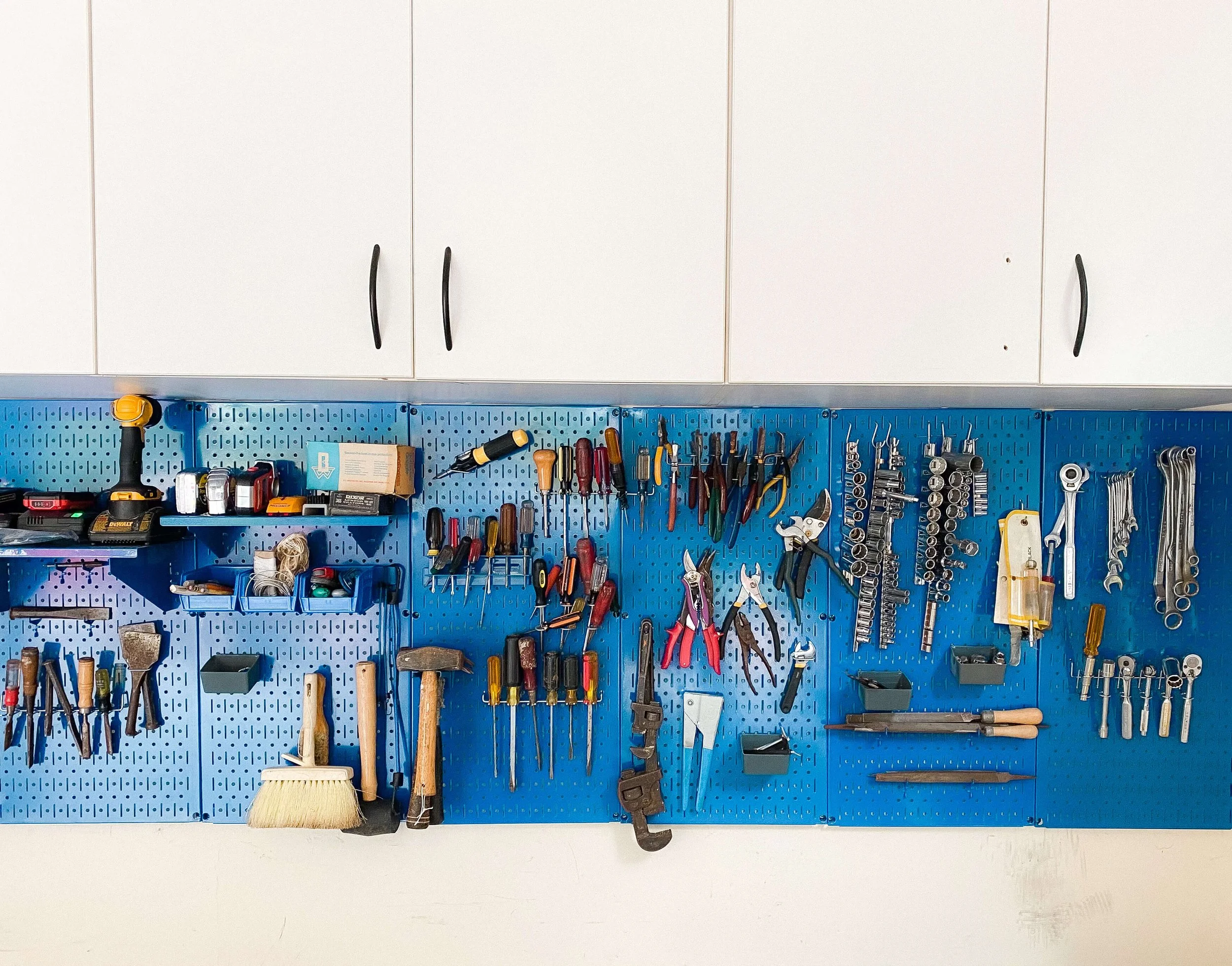 Gardening – soil, tools, pots, gloves. Pegboards or tool racks work well for vertical storage.